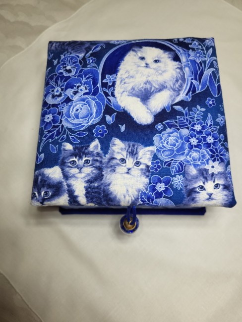 Entièrement réalisé à la main, il est garni d'un tissu - 100% coton - dans les tons bleus et blancs. Chaque motif reprend les attitudes drôles et délicates de nos chers mistigris.